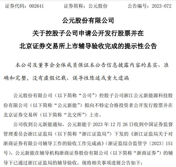 12月26日晚间,A股塑管龙头公元股份(002641)公告,公司控股子公司公元新能拟向不特定合格投资者公开发行股票并在北交所上市。12月26日,公元新能在辅导机构浙商证券的辅导下已通过浙江证监局的辅导验收。