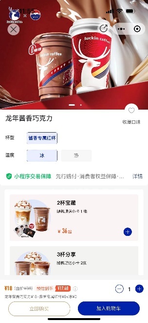 记者点开“瑞幸咖啡”小程序,龙年酱香巧克力显示售价38元/杯,优惠后为18元/杯。主要原料为纯牛奶、白酒风味厚奶(配置型含乳饮料)、香浓可可风味固体饮料。和酱香拿铁一样,也是添加了含贵州茅台的白酒风味厚奶,但不含咖啡。
