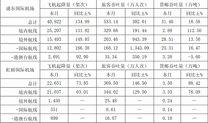 上海机场1月14日公告,2023年12月,浦东国际机场旅客吞吐量533.14万人次,同比上涨302.01%;虹桥国际机场旅客吞吐量369.5万人次,同比上涨146.5%。